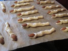 Take a heaping teaspoon of dough at a time, roll it into a ball, and then shape it into a log between your palms. Place each log on the parchment paper. Make thin cuts where the knuckles are supposed to be, and place an almond at one end like a nail.
