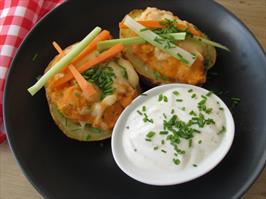 Fylla kartöfluhýðin með kjúklingafyllingu, strá osti yfir og baka í 5 mín í viðbót. Bera fram með ranch dressingu, þunnt skornum gulrótum og sellerí.
