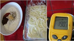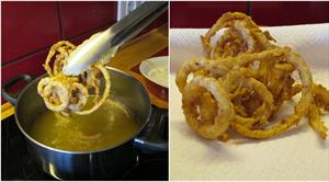 Þá er komið að því að blanda saman kryddunum og hveitinu. Síðan er olían látin hitna í djúpsteikingapotti eða stórum potti. Þegar olían hefur náð upp hita (best er að miða við 190°c) má byrja að velta lauknum upp úr hveitiblöndunni og djúpsteikja í litlum skömmtum.