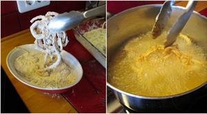 Mikilvægt er að hveitiblandan nái að hjúpa laukinn vel og unnið sé í litlum skömmtum til að laukurinn festist síður saman.