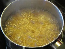 Hita sírópið í potti, ná upp góðri suðu, bæta við smjörlíki og leyfa blöndunni að sjóða þar til karamellan þykknar og verður seigfljótandi. Taka af hitanum og setja saltið saman við.